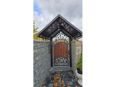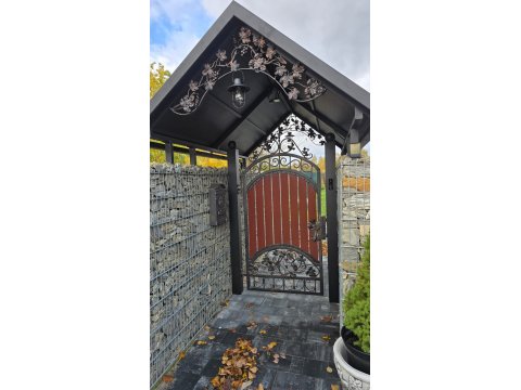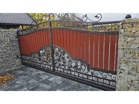 Brama dwuskrzydłowa uchylna, wykonana z profili pustych 14x14mm bądź prętów pełnych 12x12mm oraz ręcznie wyginanych liści i pałek (blacha 2mm).