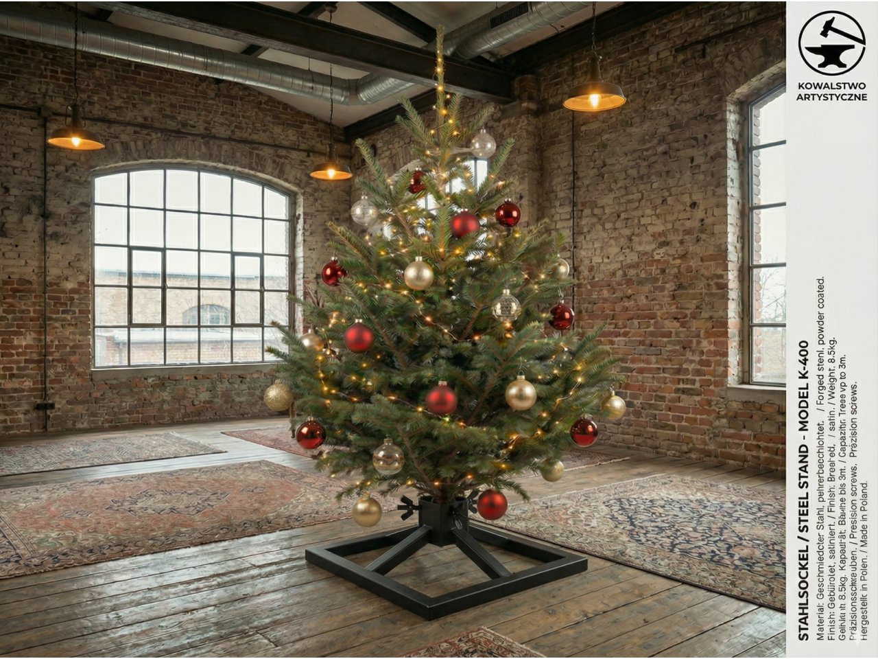 Stojak choinkowy powstaje w naszej pracowni z najwyższej jakościowo stali, a następnie jest malowany na wybrany kolor z palety RAL.