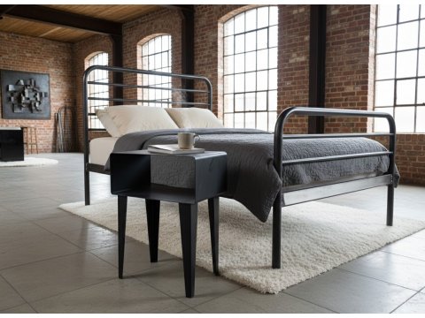 Minimalizm przemysłowy: Stolik ma bardzo "czystą" formę – składa się z wygiętego metalu tworzącego korpus oraz czterech zwężanych nóg. Brak tu zbędnych ozdobników, a widoczne ślady obróbki i matowe wykończenie podkreślają jego "warsztatowy" rodowód.